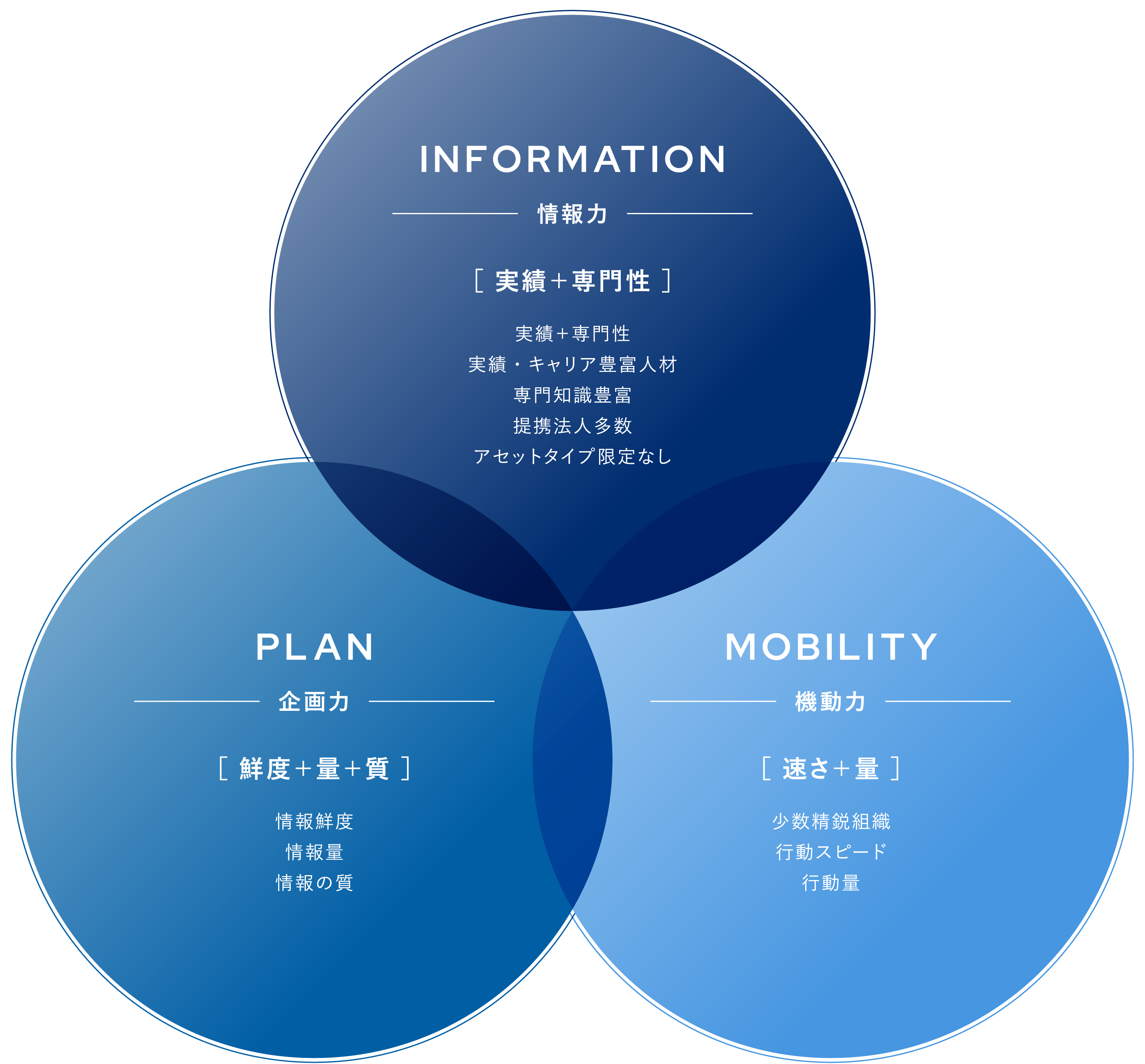 当グループの強みは、情報力+企画力+機動力にあります。そして、この3要素が高次元で有機的に機能することにあります。